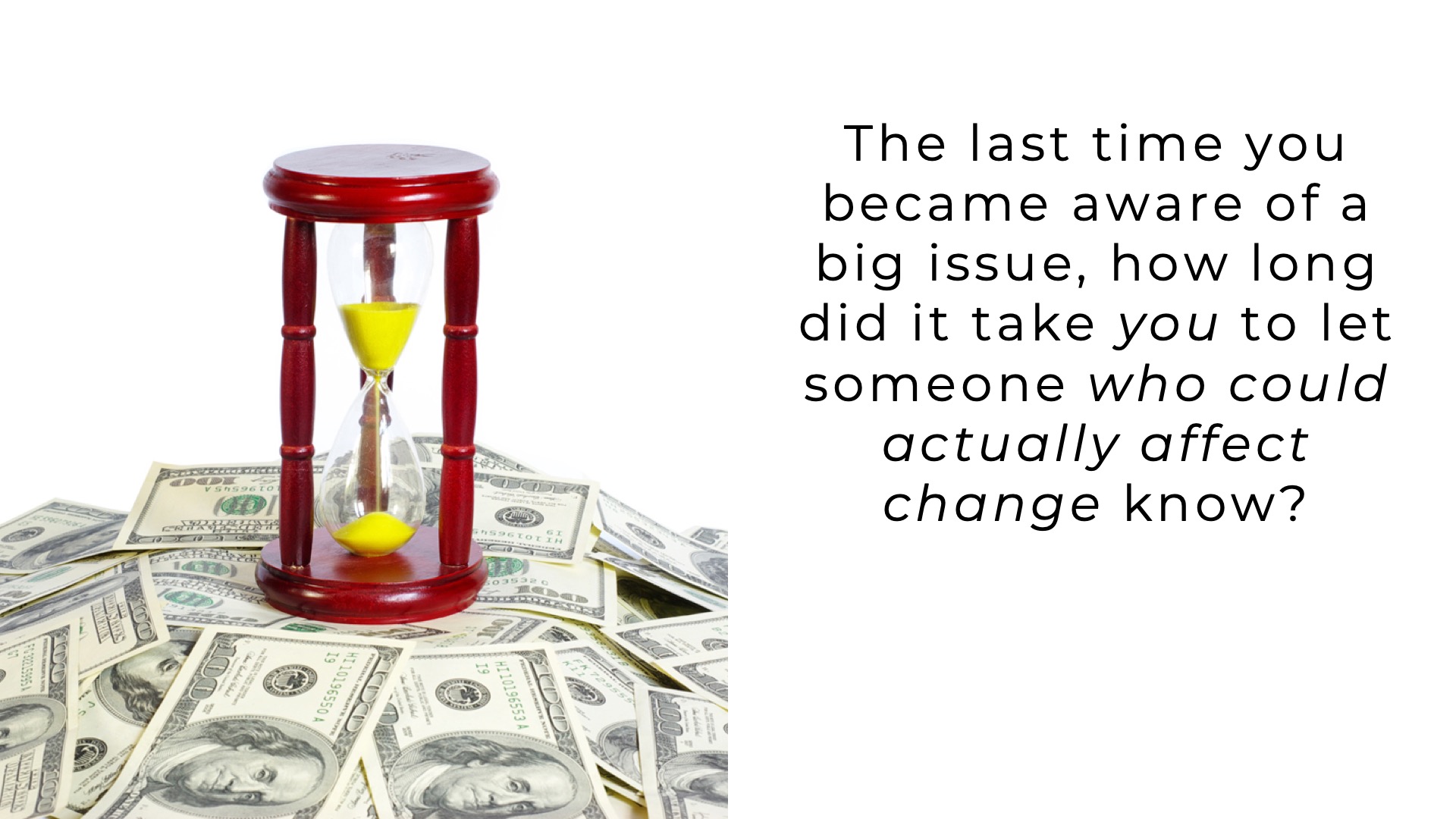 If you aren’t in management, you aren’t off the hook, “The last time you became aware of a big issue, how long did it take you to let someone who could actually affect change know?”: SLIDE: Second clock