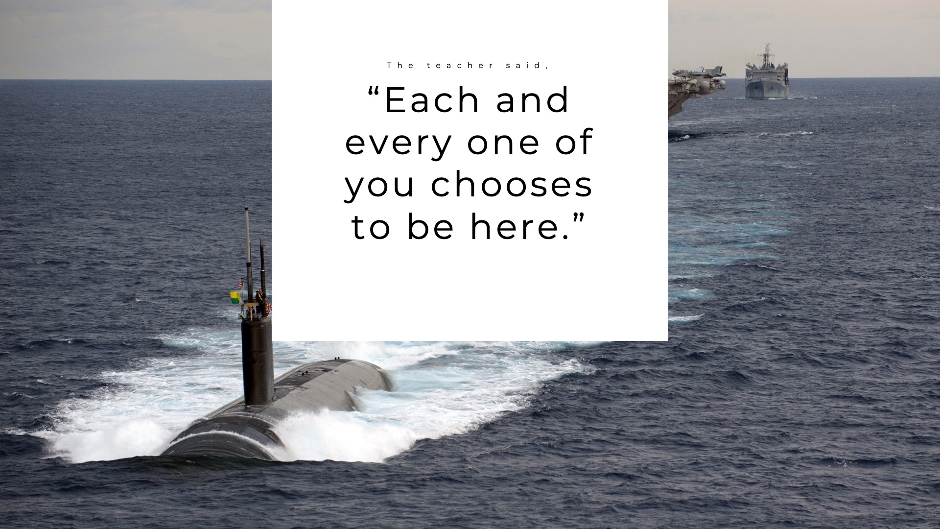 However, just before Nuclear Power School they sneak a chemistry and physics refresher. I still remember one of the civilian teachers telling us, “Each and every one of you chooses to be here.”: SLIDE: Navy 1