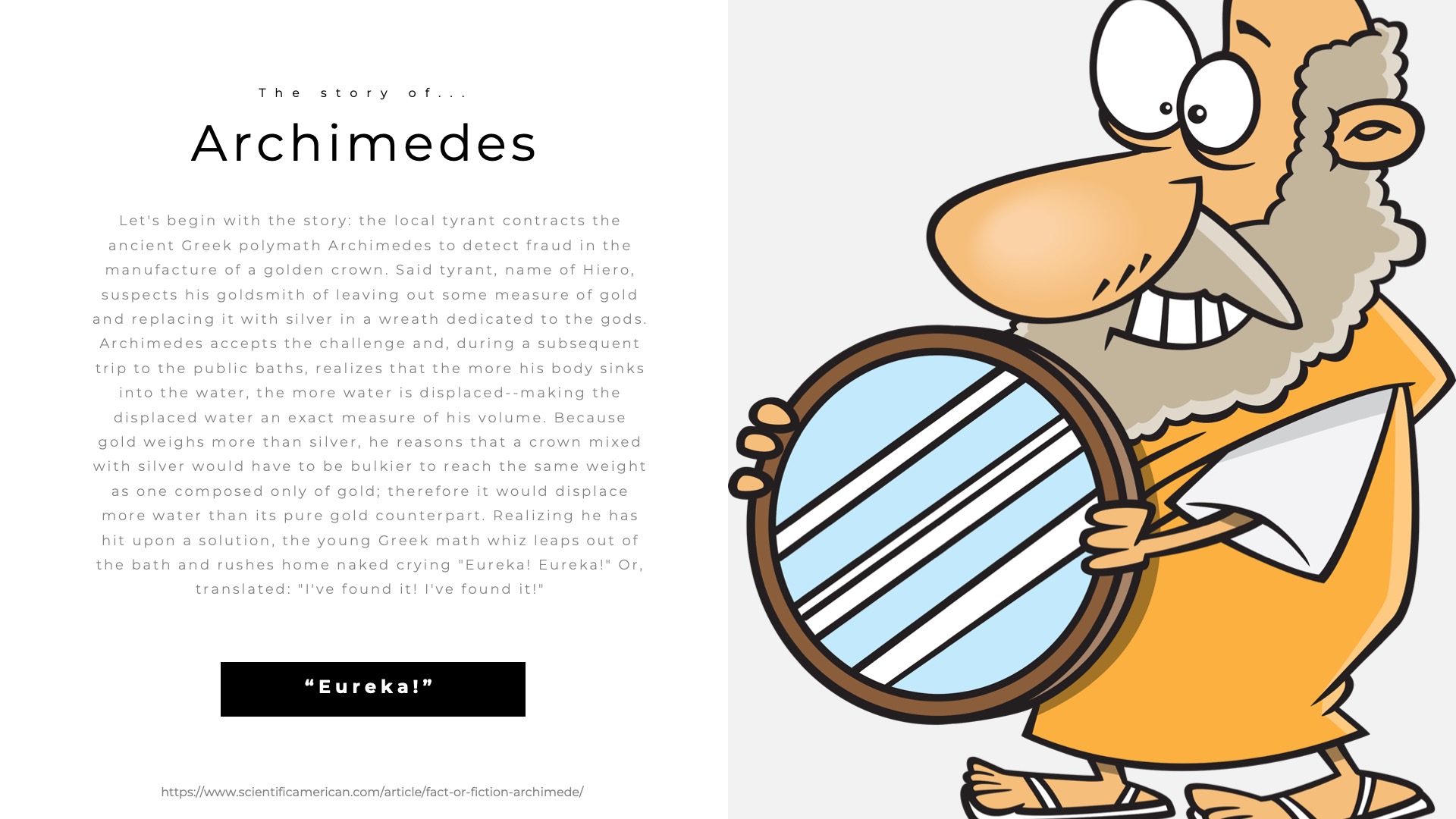 3Biello, D. (2006, December 8). Fact or Fiction?: Archimedes Coined the Term “Eureka!” in the Bath. Retrieved March 30, 2019, from Scientific American website: https://www.scientificamerican.com/article/fact-or-fiction-archimede/